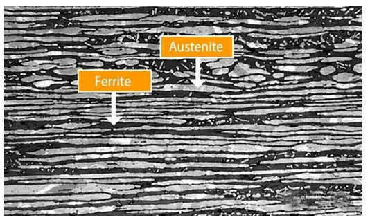 雙相不銹鋼(Duplex Stainless Steel,簡(jiǎn)稱DSS),指鐵素體與奧氏體各約占50%,一般較少相的含量最少也需要達(dá)到30%的不銹鋼。在含C較低的情況下,Cr含量在18%~28%,Ni含量在3%~10%。有些鋼還含有Mo、Cu、Nb、Ti、N等合金元素。