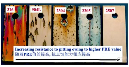 (3)在許多介質(zhì)中應(yīng)用最普遍的2205雙相不銹鋼的耐腐蝕性優(yōu)于普通的316L奧氏體不銹鋼,而超級(jí)雙相不銹鋼具有極高的耐腐蝕性,在一些介質(zhì)中,如醋酸,甲酸等甚至可以取代高合金奧氏體不銹鋼,乃至耐蝕合金。
