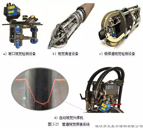 新型的不銹鋼管道焊接系統(tǒng)集成了激光視覺焊接和檢測技術(shù)。該系統(tǒng)主要包括以下組件:坡口加工站應(yīng)用的坡口視覺檢測設(shè)備(見圖2-25a),合金鋼管焊接時背部用來控制和監(jiān)視清理艙室參數(shù)的視覺清渣設(shè)備(見圖2-25b),焊接工作站應(yīng)用的根焊道視覺檢測設(shè)備(見圖2-25c),以及具有自適應(yīng)焊接控制技術(shù)的視覺外焊機(jī)(見圖2-25d)。四種組件均采用激光視覺技術(shù)同時工作,從而將管道自動焊接工藝的質(zhì)量和速度提高到前所未有的水平。