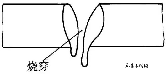 燒穿是指焊接過程中,熔深超過工件厚度,熔化金屬自焊縫背面流出,形成穿孔性缺。