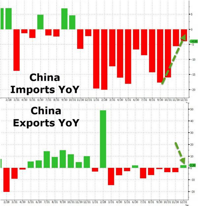 12月進口下跌4%(按人民幣計價)為2014年12月以來最小跌幅。而12月出口同比上漲2.3%(按人民幣計價)則是2015年2月以來同比首升。