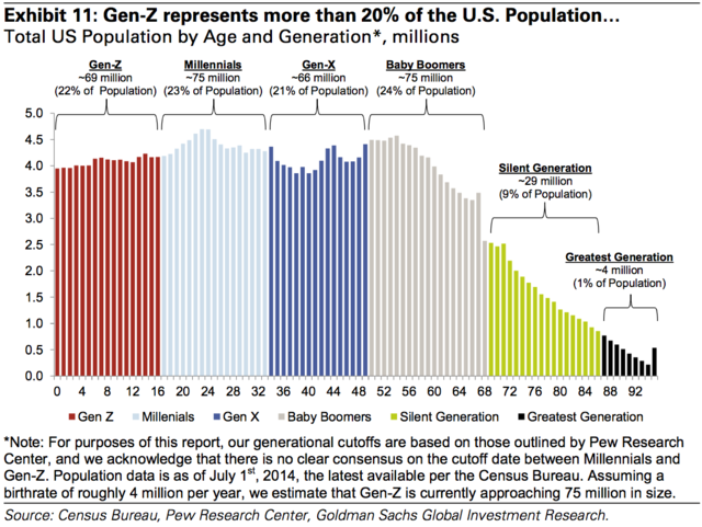 美國(guó)1998年之后出生人群,目前接近七千萬(wàn)。第一批正準(zhǔn)備進(jìn)入大學(xué)或直接進(jìn)入勞動(dòng)力市場(chǎng)。該人群繼續(xù)增長(zhǎng),很快將超越美國(guó)80后人口(約七千五百萬(wàn))。