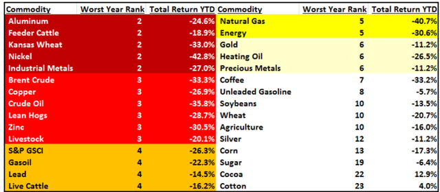 Gunzberg在11月30日的報告中指出,迄今為止,今年還不是任何一種大宗商品表現(xiàn)最糟糕的一年,但是許多大宗商品正朝著有記錄以來表現(xiàn)最糟糕的年份走去。