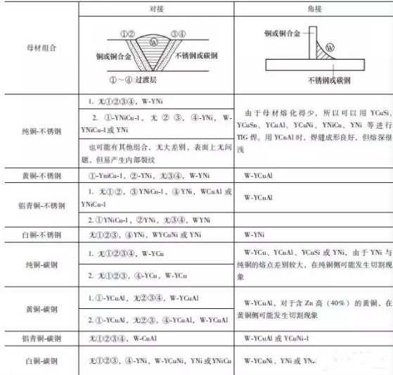 表1 碳鋼或不銹鋼與銅及銅合金熔焊時(shí)焊接材料的選擇