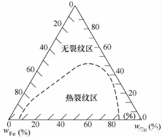 根據(jù)所選用焊接材料及熔合比的不同,不銹鋼與銅及銅合金焊接時(shí),焊縫金屬中會(huì)出現(xiàn)Fe、Cu、Ni的不同比例。在適當(dāng)比例的情況下,也會(huì)提高焊縫金屬的熱裂紋敏感性,如圖1所示。Cu-Ni填充金屬鐵或鎳或者兩者的共同稀釋率必須控制在5%以下。這種限制通常也可以用于其他Cu填充金屬。