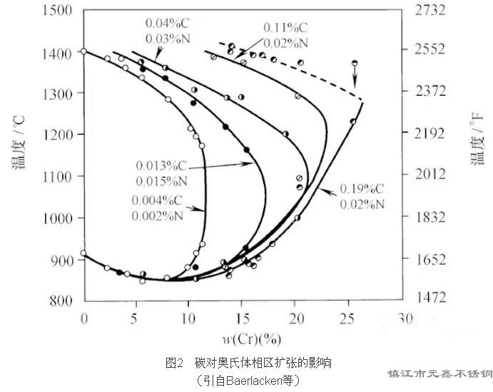 元素,它使γ相回線區(qū)擴(kuò)大,即在鉻含量高得多的成分下仍使奧氏體在高溫區(qū)保持穩(wěn)定。圖2示出了碳對(duì)擴(kuò)大奧氏體相區(qū)的影響,請(qǐng)注意即使很少的碳含量,也可使γ相回線區(qū)顯著地?cái)U(kuò)大,這對(duì)于開發(fā)馬氏體鋼很重要,因?yàn)橐诶鋮s時(shí)形成馬氏體,則在高溫時(shí)鋼必須是奧氏體。而對(duì)于鐵素體類鋼,γ相回線面積必須予以控制,使得高溫時(shí)沒有或者只有很少奧氏體存在。