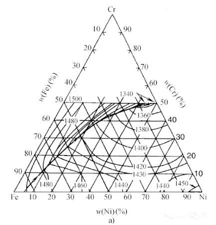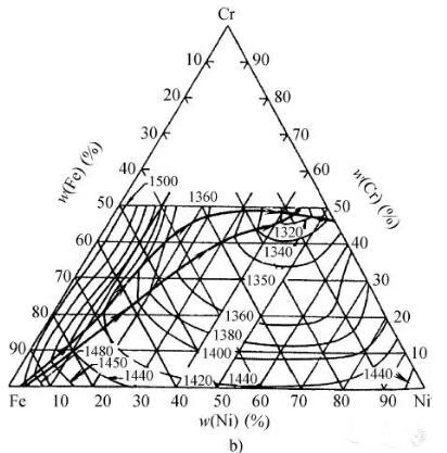液相面在圖4a上顯示了一條從相圖三角形靠近富Fe角的點(diǎn)出發(fā)到Cr-Ni邊的粗黑曲線。這條曲線把凝固成鐵素體初始析出相的成分和凝固成奧氏體初始析出相的成分區(qū)分開來。在接近48Cr-44Ni-8Fe的成分點(diǎn)形成了一個(gè)三元共晶點(diǎn)。
