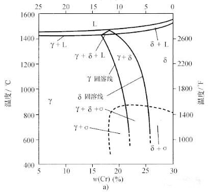 因?yàn)殂t是不銹鋼的主要合金元素,所以把圖1所示的鐵-鉻系相圖作為討論不銹鋼相平衡的起點(diǎn)。注意相圖中Cr在高溫時(shí)全部溶于鐵中,所有Fe-Cr合金凝固時(shí)都生成鐵素體。而凝固溫度區(qū)間很窄。對(duì)低鉻含量的合金在912~1394℃ 溫度區(qū)間形成一個(gè)奧氏體區(qū),通常被稱為γ相回線。鉻的質(zhì)量分?jǐn)?shù)高于12.7%的合金在高溫時(shí)全是鐵素體,而鉻的質(zhì)量分?jǐn)?shù)低于12.7%的合金在這個(gè)γ相回線溫度范圍內(nèi)多多少少要形成一些奧氏體。而鉻的質(zhì)量分?jǐn)?shù)低于12%的合金在此回線的溫度范圍內(nèi)將是全奧氏體組織,形成的奧氏體在快速冷卻時(shí)可轉(zhuǎn)變成馬氏體。在Fe-Cr系中存在一種稱為σ相的低溫平衡相,這種相是具有(Fe,Cr)化