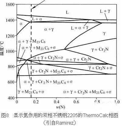 圖8給出了另外一個(gè)例子,這是以氮作為成分變量由計(jì)算得到的雙相不銹鋼2205的相圖。一個(gè)典型的氮的質(zhì)量分?jǐn)?shù)是0.15%,圖上以一根垂直虛線表示。由圖可知即使在高溫,合金也不能得到全鐵素體組織,而微觀組織中總有一些奧氏體存在,這就可以有效地減少在焊接熱影響區(qū)鐵素體的長大。圖中也示出