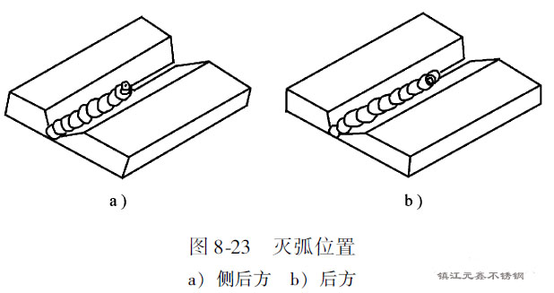 4)焊接電纜卡頭在工件上要卡緊,以免發(fā)生打弧現(xiàn)象,燒傷表面。引弧可以采用劃擦法,但最好采用碰擊法,并且都應(yīng)在坡口內(nèi)進行。嚴禁在鋼板上隨便引弧,以免電弧擦傷處腐蝕性能的降低。更換焊條或者焊接中斷后繼續(xù)焊接時,重新引弧的位置應(yīng)在離末尾焊點10mm的焊道上,然后以普通焊速將電弧移到末尾焊點上,進行接頭的焊接。滅弧時,一般應(yīng)把電弧移到熔池的后方或側(cè)后方,然后熄滅。這樣可以使收弧點逐漸縮小,并且落在焊道上,如圖8-23所示。其優(yōu)點是收尾熔池飽滿,不易產(chǎn)生裂紋。