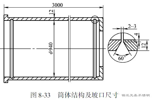 筒體縱縫、環(huán)縫的坡口形式均為V形,如圖8-33所示。坡口用機械加工方法或用碳弧氣刨刨成,氣刨后的坡口表面要清除熔渣,并打磨光亮。筒體所有縱環(huán)焊縫的坡口開在筒內(nèi),鈍邊開在筒外。其優(yōu)點是焊根在筒體外,便于碳弧氣刨進行清根操作,防止燒壞衣服和燙傷;另外,氣刨產(chǎn)生的熔渣不粘在筒體內(nèi)壁上,保證筒內(nèi)光潔,提高耐蝕性。