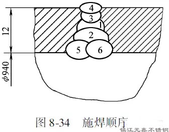 筒體成形后裝配定位焊,每隔200~250mm定位焊25mm,定位焊縫高度為4~5mm。施焊順序如圖8-34所示。先在筒內(nèi)焊接第1~2道,這兩道焊縫的起焊和終止端應(yīng)相反。然后在筒外清理焊根,再焊第3~4道。同樣注意各道之間的起焊與終止方向要相反。這樣焊波錯開以免產(chǎn)生夾渣。焊條不作橫向擺動,對準中心線焊接。清理焊根時在筒外用碳弧氣刨進行,碳棒直徑為8mm,電流為250~300A,碳棒與焊縫夾角45°,刨槽深4mm,將第一層焊道根部可能有缺陷的金屬全部刨除,刨后清除熔渣。當(dāng)?shù)谌、四層焊道焊完之后,最后在筒?nèi)焊接與腐蝕介質(zhì)相接觸的第五、六層焊道。