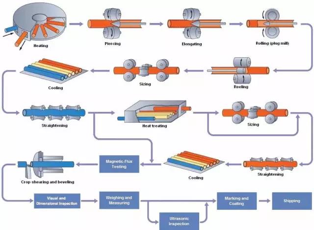 管坯準(zhǔn)備及檢查→管坯加熱→穿孔→軋管→荒管再加熱→定(減)徑→熱處理→成品管矯直→精整→檢驗(yàn)(無損、理化、臺檢) →入庫