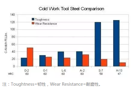 從硬度、耐磨及韌性三個指標(biāo)(見下圖)來看,S7的性能介于A2和H13之間,可彌補(bǔ)此二者之不足。