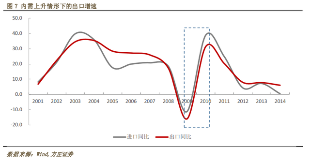 中國的“四萬億計劃”確實造成了國內(nèi)需求急劇上升。然而,09年的出口負增長主要誘因還是金融危機導(dǎo)致了外部經(jīng)濟形勢急劇下降。如果說 2010-2014 年的出口增速下行是過熱內(nèi)需的結(jié)果,那么應(yīng)該隨之而來的是進口同比的同步上升。