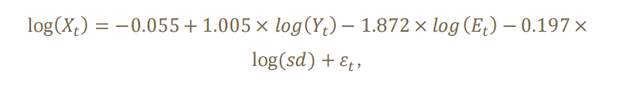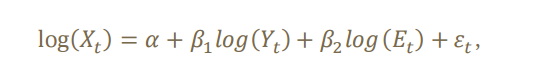 其中,Xt是1995-2015年間中國出口總額的季度值,Yt為幾個主要貿(mào)易伙伴國的加權(quán) GDP,包括三個國家/地區(qū)——美國、歐盟、日本,各自的權(quán)重為對其出口額占總出口的比例,Et是人民幣的實際有效匯率指數(shù)。β1 衡量貿(mào)易伙伴國的收入對出口需求的彈性,從理論上講,β1 > 0,即貿(mào)易伙伴的收入上升會提振國內(nèi)出口。β2 < 0,即人民幣升值會降低出口。