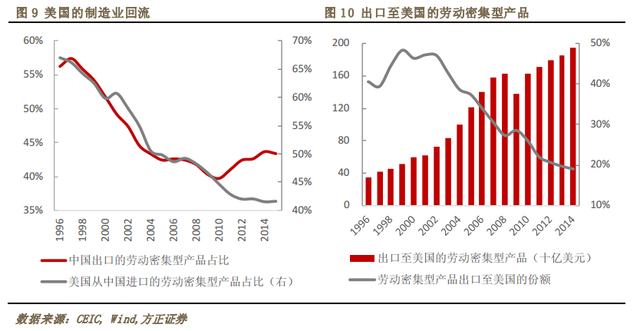 為驗證這一點,方正證券們按國際產(chǎn)業(yè)標(biāo)準(zhǔn)分類(SITC)將出口商品分為 10 大類。數(shù)據(jù)分析顯示,美國制造業(yè)確實存在回流。但是,如果觀察勞動密集型產(chǎn)品出口就會發(fā)現(xiàn)兩個現(xiàn)象:
