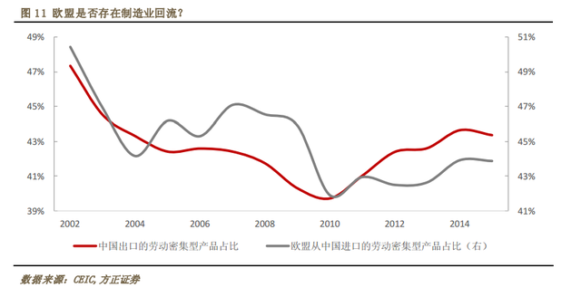 在2010年中國的勞動密集型產(chǎn)品出口開始回升后,歐盟進口的勞動密集型產(chǎn)品來自中國的份額也同比開始同步上升,因此,歐盟不存在“制造業(yè)回流”引發(fā)中國出口增速下行的問題。