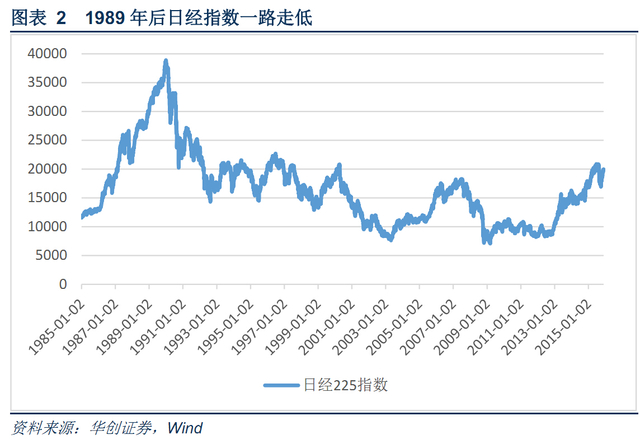 泡沫經濟崩潰以后,最直接的影響就是資產價格的嚴重縮水。泡沫經濟崩潰后,日本的土地資產和股票資產約縮水1300萬億日元。從股票價格變化來看,1989年12月,東京證券交易所的日經225指數曾高達38915.87 點,股票的總市值高達630 萬億日元,大約相當于當年日本名義GNP總額的1.6倍。1990年泡沫破滅后,日經指數迅速跌破2萬點大關,跌幅幾乎達到50%,短短一年的時間里東京股票市場的總市值蒸發(fā)了270萬億日元。