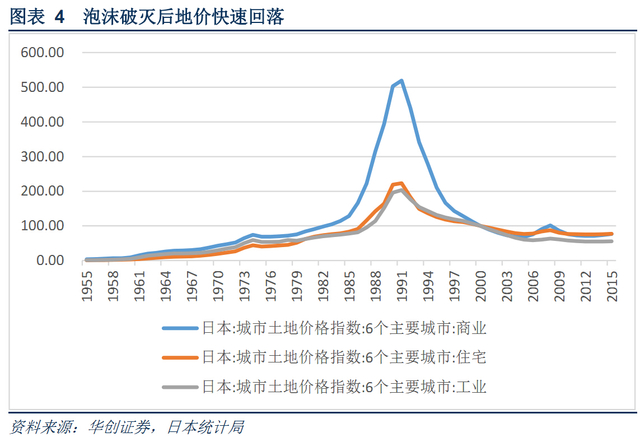 再從房地產的價格來看,1990年地價雖然繼續(xù)上升,但 1991 年也轉為了下降。1992 年以后,各大城市圈土地價格更是連年下降,1994 年,土地資產總值減少為 1824 萬億日元,回到了 1988 年的水平。之后,土地價格的下跌趨勢仍未停止,并貫穿了整個90年代。