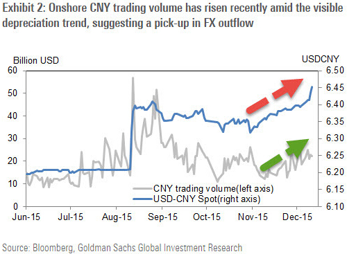 高盛表示,自11月30日國(guó)際貨幣基金組織(IMF)宣布將人民幣納入SDR后,監(jiān)管層開始更加接受人民幣的貶值。盡管最近歐央行不夠鴿派的利率決議導(dǎo)致美元下跌,這在一定程度上緩解了人民幣的拋壓。但是最近在岸人民幣成交量上升,以及離岸-在岸價(jià)差擴(kuò)大,顯示資本外流情況可能加劇。