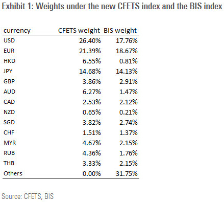 高盛提示到,CFETS指數(shù)由13種貨幣按對(duì)中國(guó)的貿(mào)易重要性加權(quán)構(gòu)成,其中剔除了再出口的影響。該指數(shù)中,美元和歐元的權(quán)重要顯著高于國(guó)際清算銀行(BIS)的中國(guó)有效匯率。美元、歐元、日元、英鎊和港元五種主要貨幣權(quán)重在CFETS指數(shù)中占到73%,對(duì)應(yīng)BIS的指數(shù)中只占到54%。